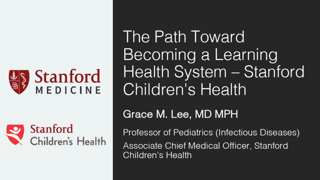 This talk will discuss a framework for enabling improvement and building capacity through project implementation. To facilitate our progress in developing a learning health system that enables continuous improvement and innovation in health, we have developed initiatives that benefit our patients, our care teams, and our organization. The goal is to ensure new knowledge is captured as a by-product of our delivery system and that best practices are integrated into our daily work. The Clinical Data Registry Program supports the use of registries to improve care and enable new discoveries. The Value Improvement Program enhances our capacity to lead value-based care delivery improvements across the care continuum. Our newly launched PEDSnet partnership will allow us to collaborate with a multi-institutional network of health systems on funded research and quality improvement projects. Patient and family engagement are critical for all 3 programs at Stanford Children’s Health.