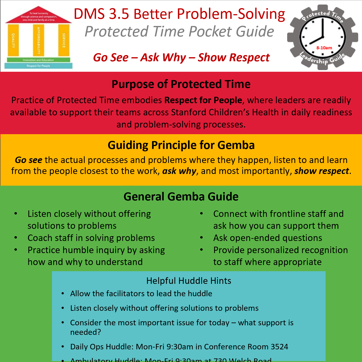 This two-page infographic discusses the purposes of protected time and how to use Gemba as a problem-solving tool. The second slide lists prompting questions useful in the Gemba process under the categories of ‘Reflections’, ‘Recognition’, ‘Problem-Solving’, and ‘Readiness’.