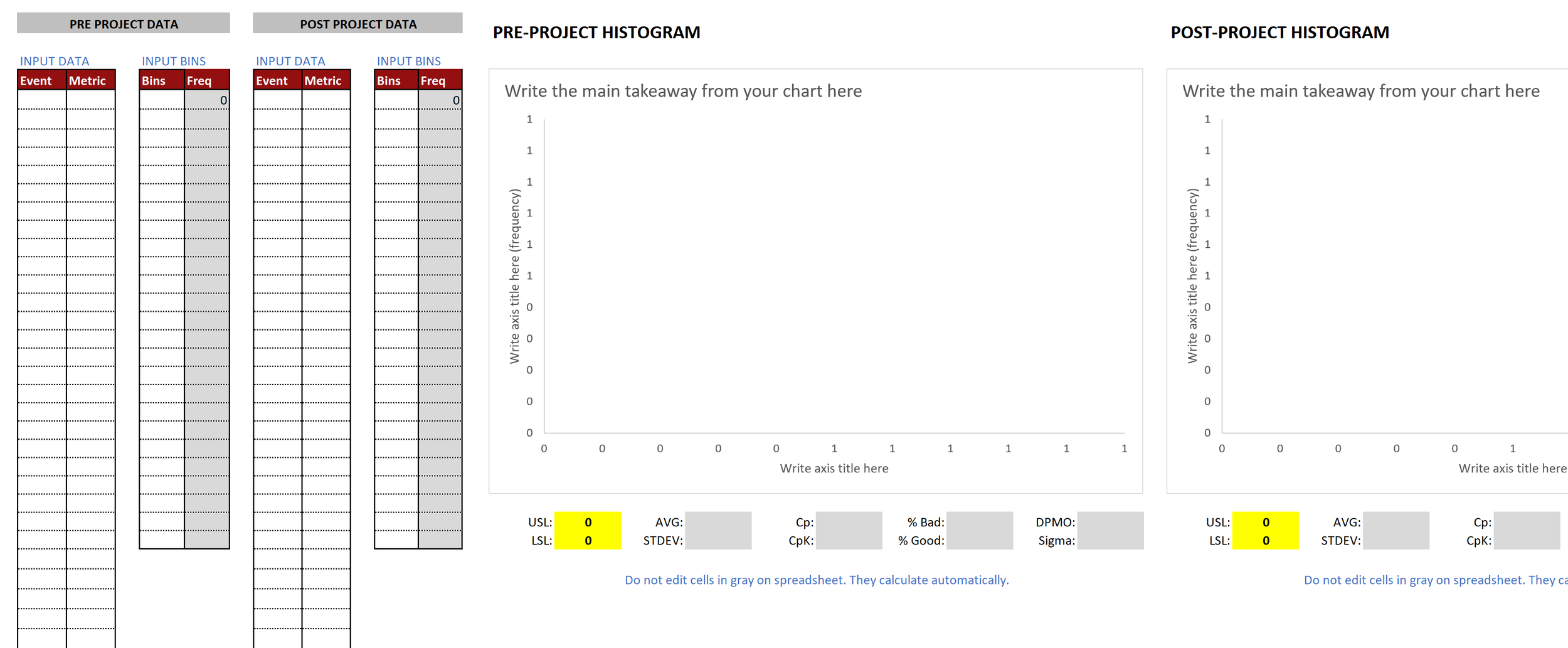 Visualization of improvements or lack-there-of is important in verifying the effectiveness of an implemented program. This template in excel provides a means to compare the performance of a process before and after implementing a change. The second sheet provides sample pre- and post-project data.
