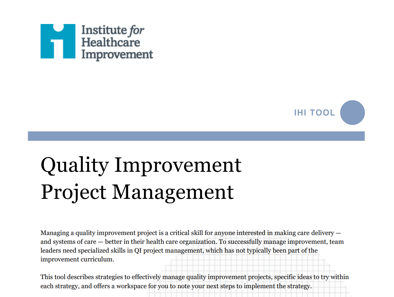 This QI project management worksheet offers strategies for project leaders to effectively manage QI projects. Using this tool, leaders will be given specific ideas to try and a notetaking space within each of the following strategies— frontloading work, building the team, predicting, creating, and keeping pace, focusing on learning, and starting with the end in mind.