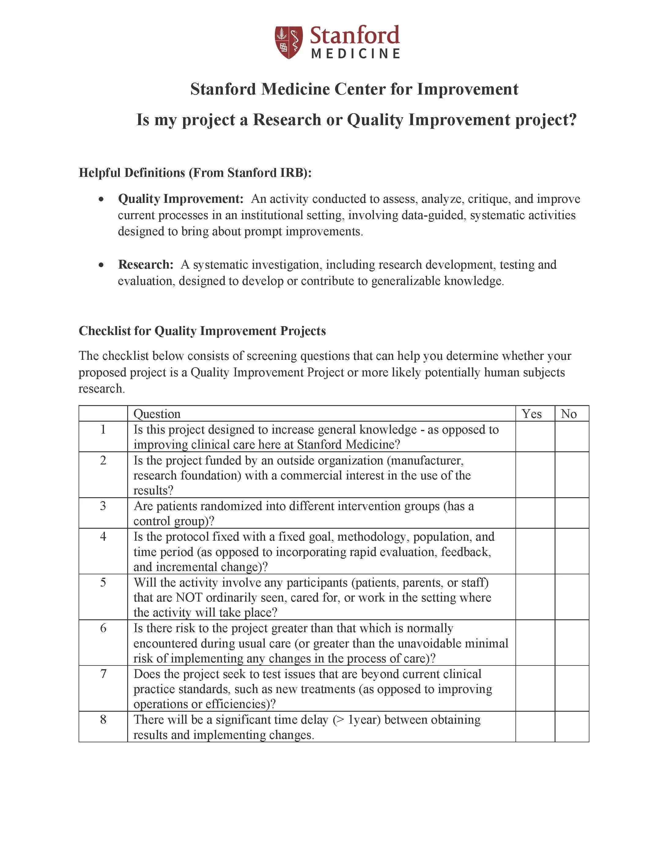 Created by the SMCI ERPG Work Group, this tool is comprised of a checklist that helps you determine if your project is considered quality improvement or human subjects research subject to IRB oversight. It also includes guidelines for those who want to publish findings of their QI projects.