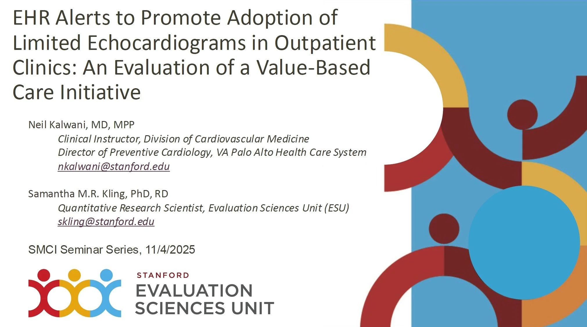 We're excited to share a collaborative success story! Stanford Health Care (SHC) supported the Evaluation Science Unit (ESU) to partner with leaders of a Value-Based Care project focused on the use of cardiac imaging in outpatient clinics. This project included implementation of an EHR alternative alert to promote adoption of lower cost limited rather than full echocardiograms for appropriate patients in cardiology and primary care clinics. Through a mixed-methods evaluation, we quantitatively assessed the effect of the alert on ordering patterns and qualitatively explored physician perspectives on the intervention. Join us to learn how the evaluation results can inform future value-based care initiatives and how similar projects can effectively integrate researchers at the ESU into quality improvement efforts.