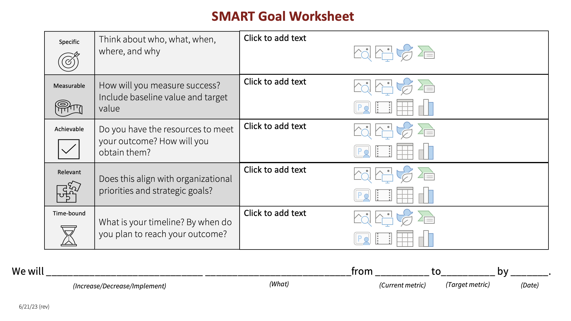 SMART goals are specific measurable and achievable goals that one can set to pace a project. This worksheet provides prompting questions for each part of SMART, and notetaking areas to jot down answers and/or ideas.